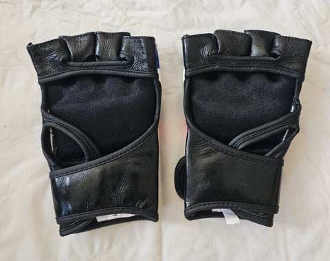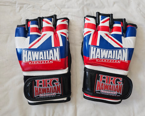 NEW! "HFG Top Grade" Pro-Style Hawaiian Flag MMA Gloves: All genuine cowhide leather improved construction built for durable wear and slimmer contour design. Segmented-palm and open thumb design with 3/4” foam padding provide great protection and safety for your hands and your opponent. Exposed finger design is ideal for no-holds, gripping, and grappling. Hook-and-loop wrap around 2 ½” wrist closure for support and snug fit. Best Glove that we carry!