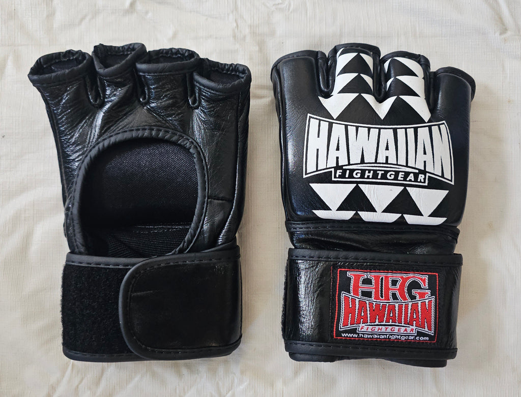 Newest Arrival! HFG Ultimate "Tribal" MMA 4 oz. gloves, all genuine “highest-quality” cowhide leather construction built for durable wear. Open-palm with 3/4” foam padding provides great protection and safety for your hands and your opponent. Exposed finger design is ideal for no-holds, gripping, and grappling. Hook-and-loop wrap around 2 ½” wrist closure for support and snug solid fit.